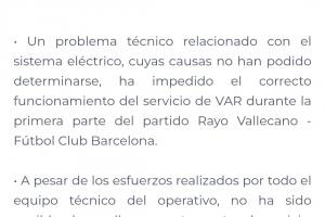 由于电力系统相关技术问题(具体原因尚未查明),导致巴列卡诺对阵巴塞罗那足球俱乐部比赛上半场的VAR服务未能正常运行。