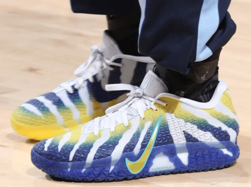 比赛中,莫兰特上脚母校莫瑞州立大学配色Nike JA3“Murray State University”。